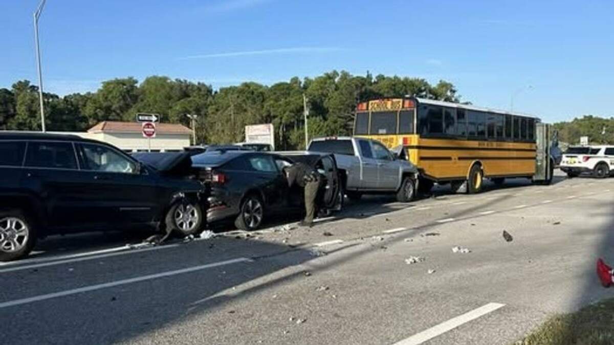 A photo shared by the sheriff's office on Facebook shows the bus at the front of the pile-up. While they didn't share details of how the crash occurred, it appears a pickup truck struck the bus from behind, while a sedan crashed into the truck and an SUV ran into the sedan.