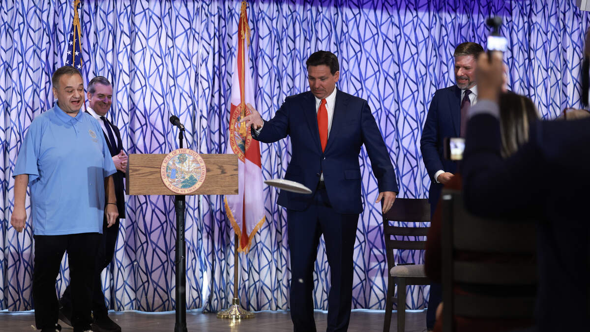 Gov. Ron DeSantis dropped a plate on the floor during a news conference held at the Greek restaurant Santorini by Georgios Wednesday on Miami Beach.